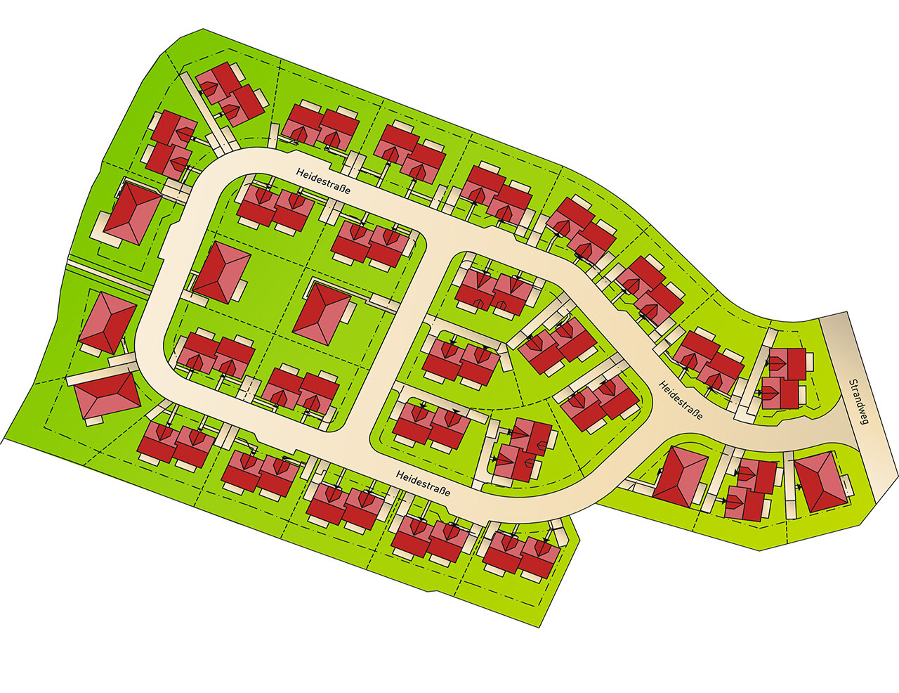 Wir planen und bauen ganze Ferienhaussiedlungen für Investoren. Ein anschauliches Beispiel für ein solches Großprojekt können wir Ihnen direkt an der Ostsee präsentieren. Hier an der Eckernförder Bucht ist mit unserer Hilfe ein gemütliches Ferienhausgebiet aus Energiespar-Häusern entstanden. 50 Doppelhaushälften, davon 46 Kapitänshäuser und vier Friesenhäuser, sowie sieben Bungalows ergeben ein ansprechendes, einheitliches Bild in rotem Verblendstein.