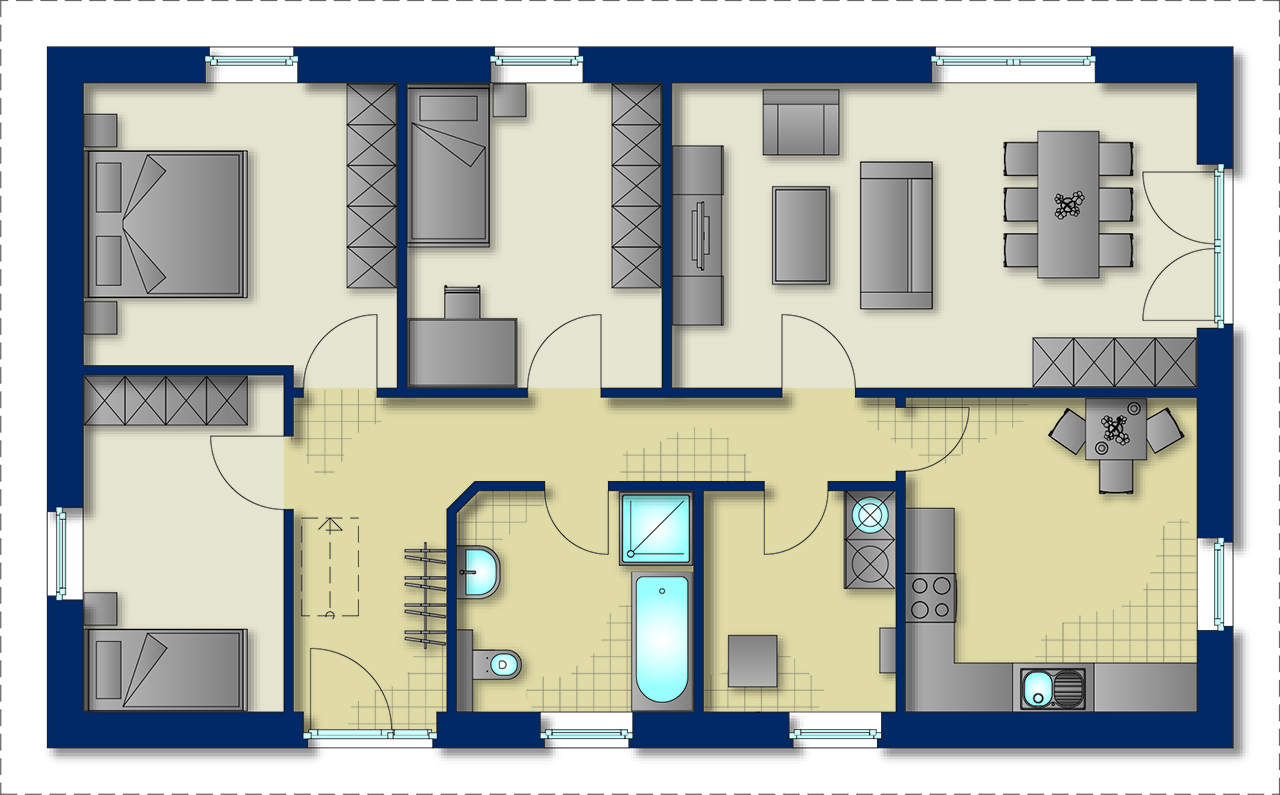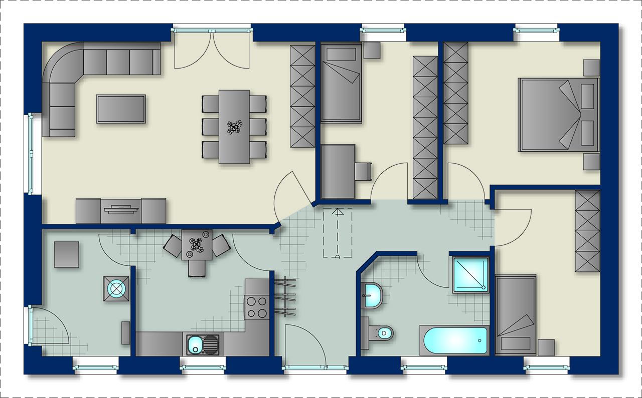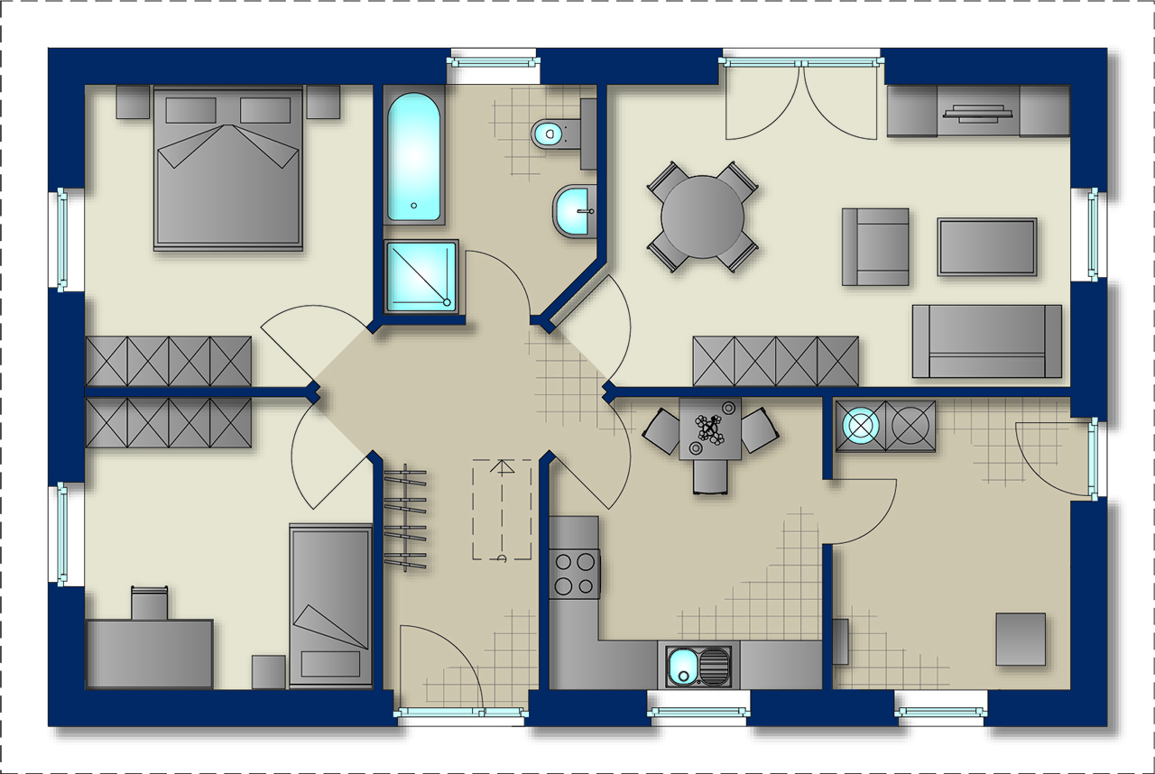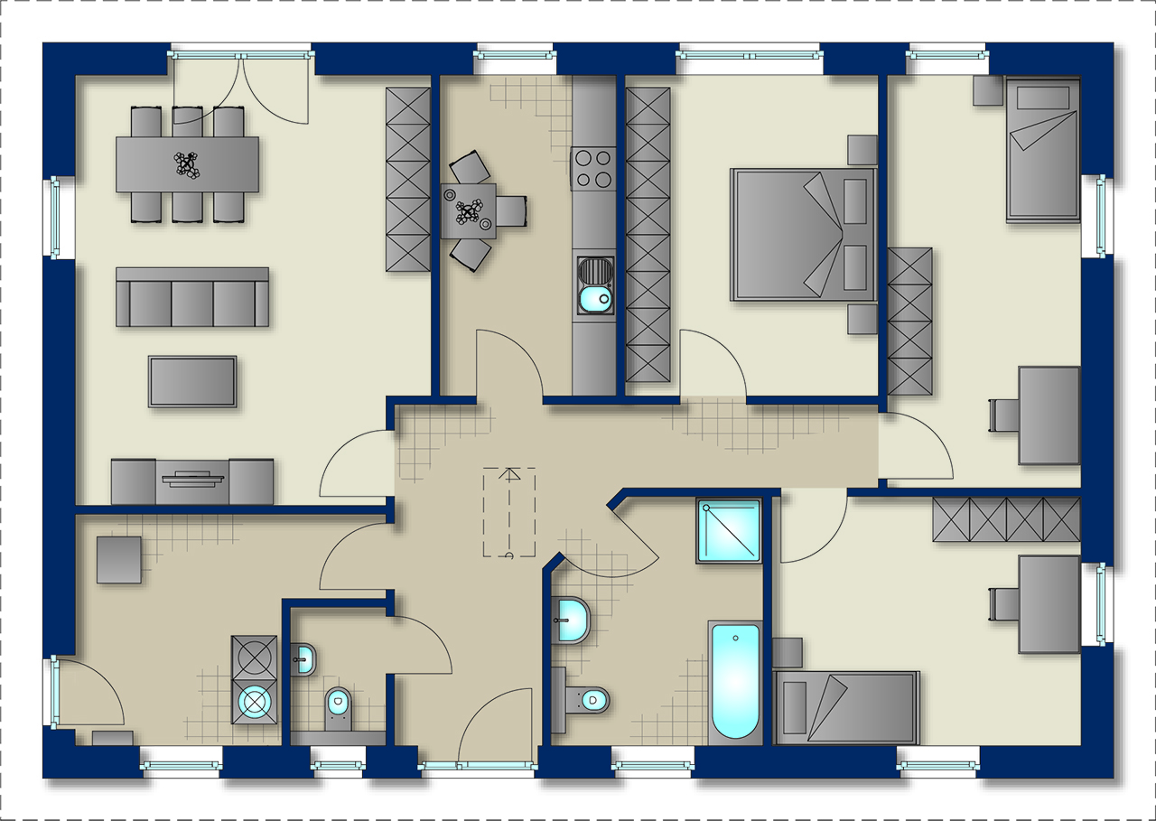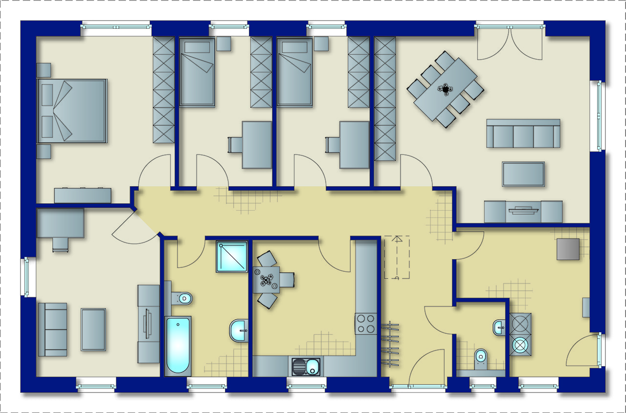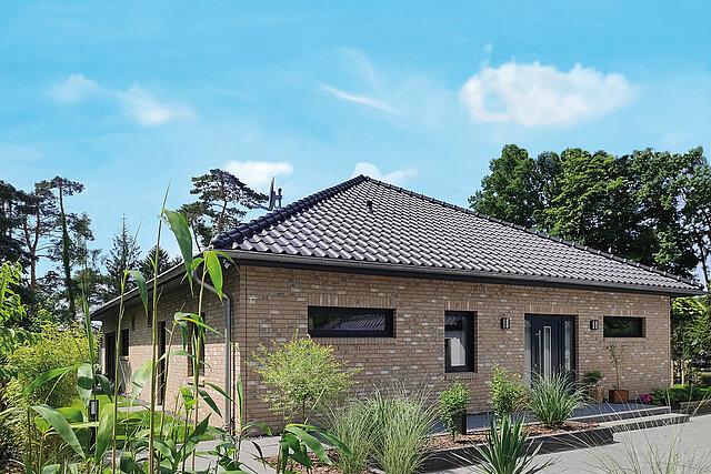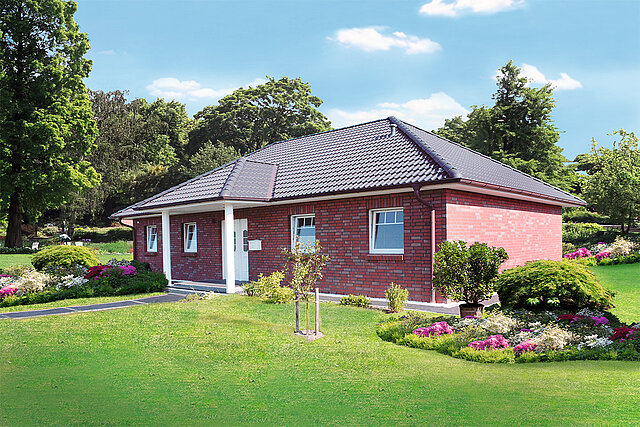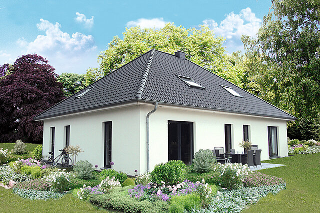 Unser Bungalow in Massivbauweise eignet sich vor allem für die Bebauung von größeren Grundstücksflächen. Indem alle Wohnbereiche auf einer Ebene vereint sind, ist diese Bauweise nicht nur ideal für unsere älteren Bauherren oder Menschen mit Mobilitätseinschränkungen, sondern ebenso für Familien mit kleinen Kindern. Unzählige Gestaltungsmöglichkeiten wie eine überdachte Terrasse, der Anbau eines Wintergartens oder auch ein Vordach im Eingangsbereich ermöglichen Ihnen eine individuelle Planung und machen Ihr Eigenheim zu einem echten Einzelstück. Unsere Entwürfe lassen keine Wünsche offen – und wenn doch, können wir den Grundriss frei nach Ihren Vorstellungen, ohne Aufpreis, anpassen. Übrigens: Mit der Dachneigung von 30° haben Sie sogar noch zusätzlichen Stauraum auf dem Dachboden.